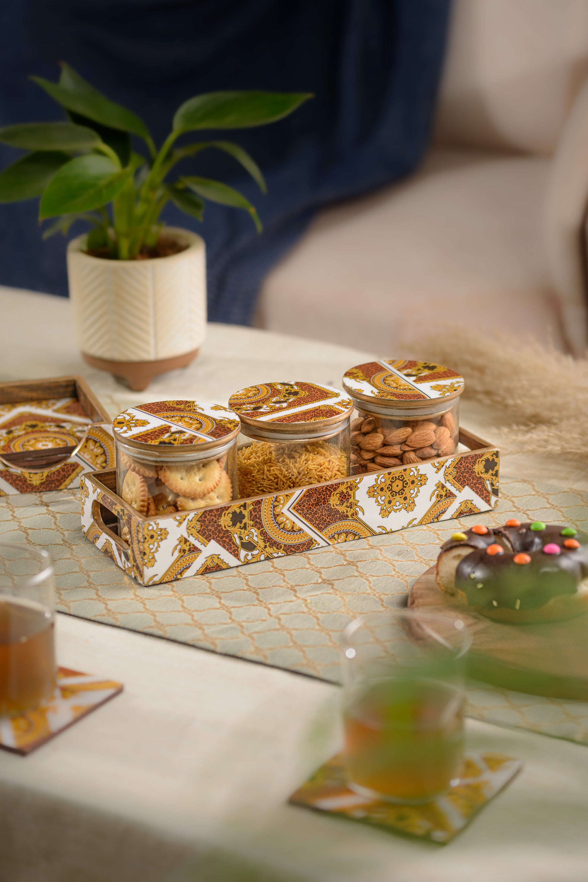 Bring onto your table the persona of an exquisite borosilicate air-tight candy jar set, with a vintage golden design of ‘Classico Indiano’.