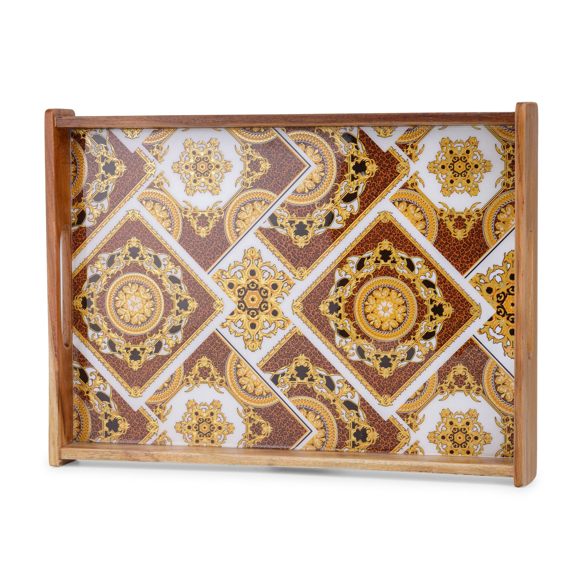 Bring onto your table the persona of premium quality teak wood tray with a vintage golden design of, ‘Classico indiano’.