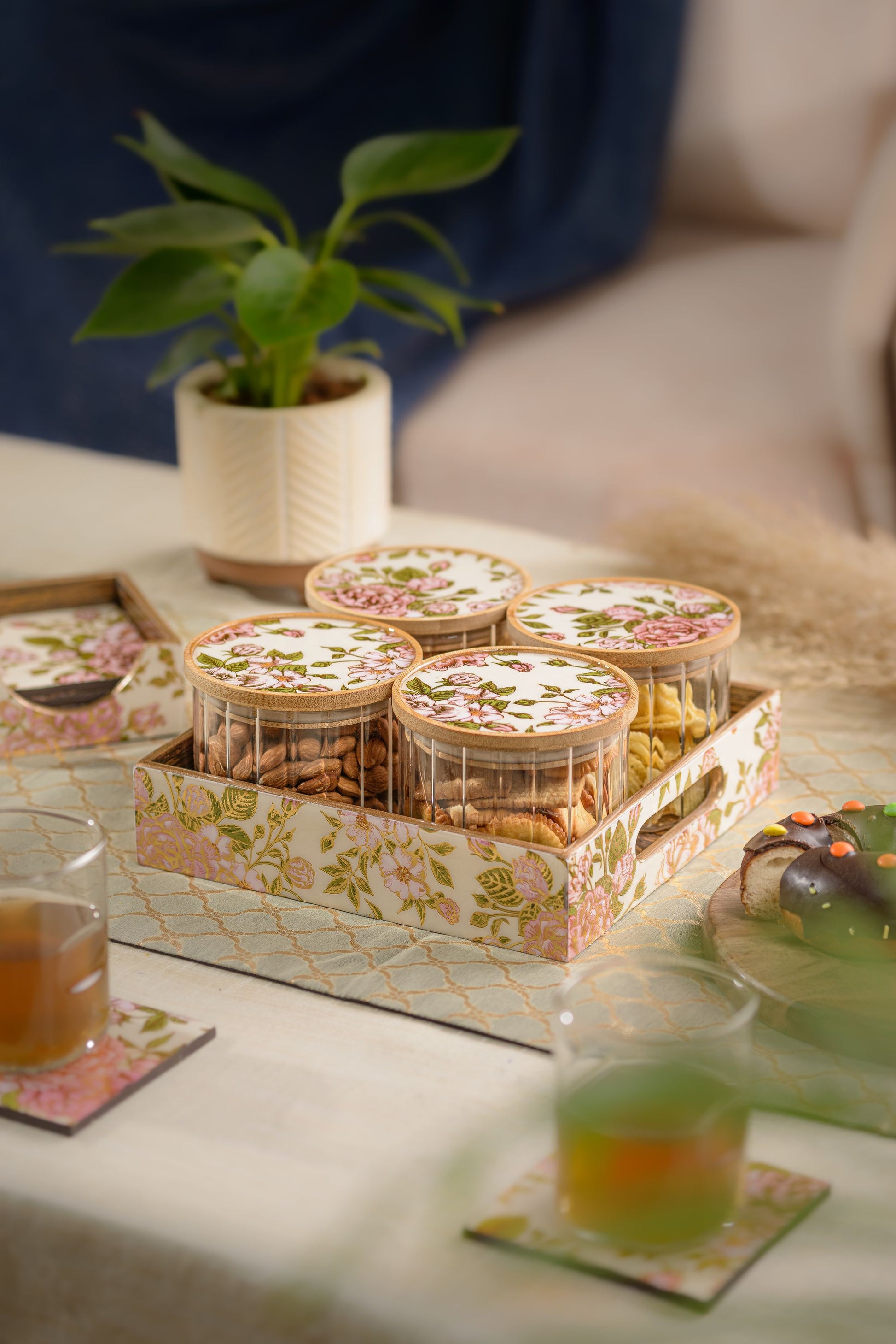 Tray: Designer tray for holding the jars, made of laminated mdf. Covered from all sides.