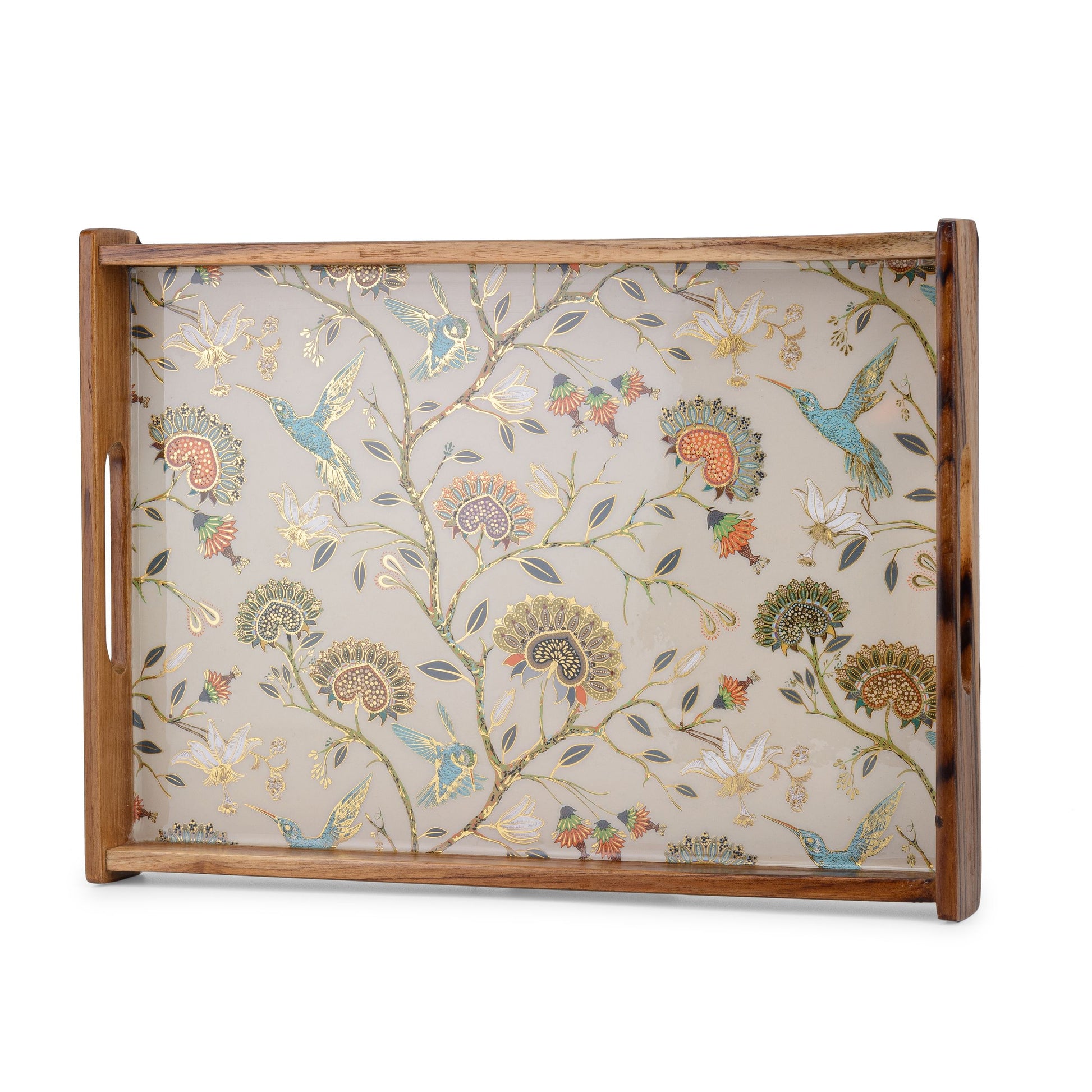 Material: The frame of the tray is made up of premium quality teak wood. The base of the tray is made up of laminated mdf with resin coating.