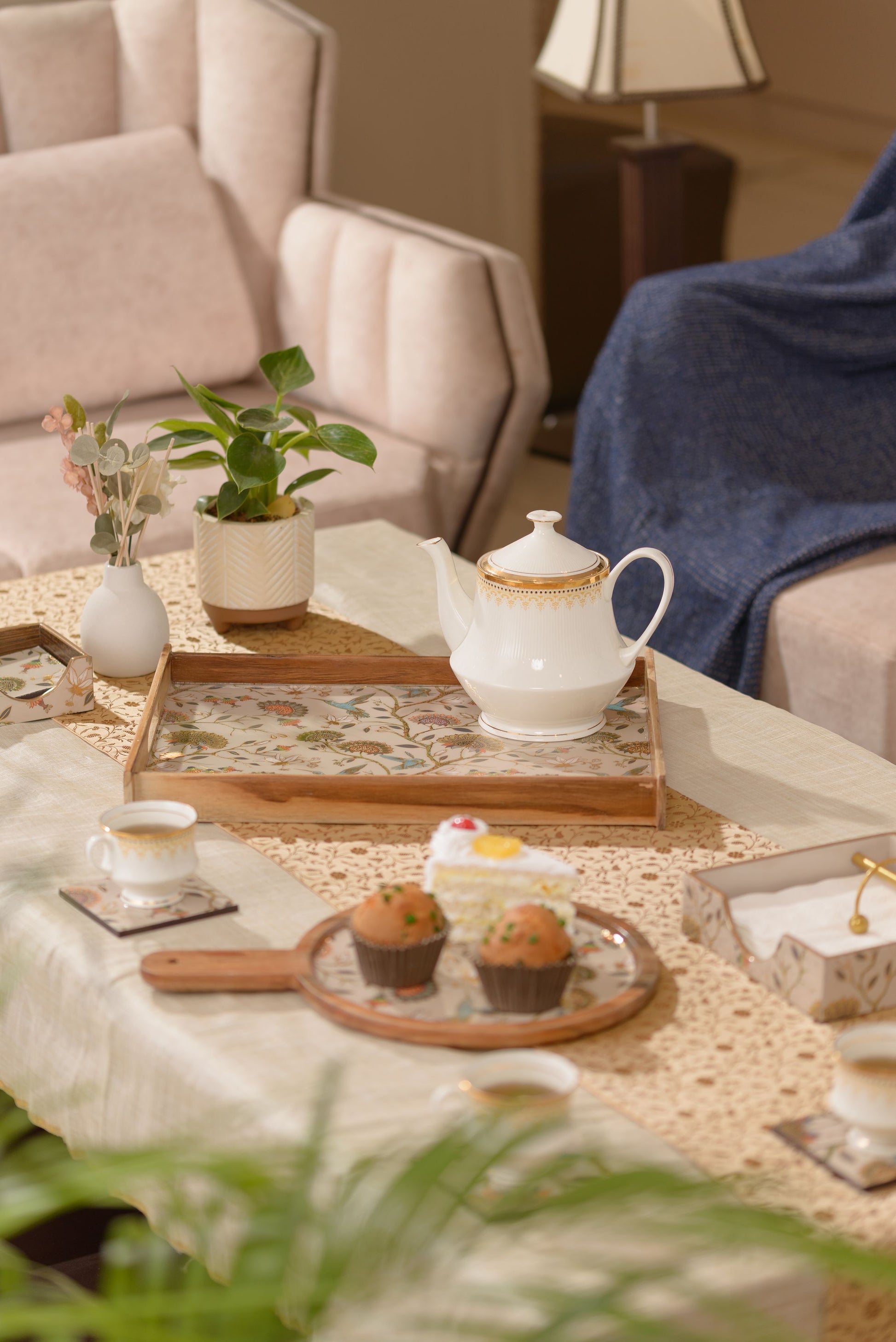 Bring onto your table the persona of premium quality teak wood trays with a vintage golden design of, ‘Gardenia exotica’.