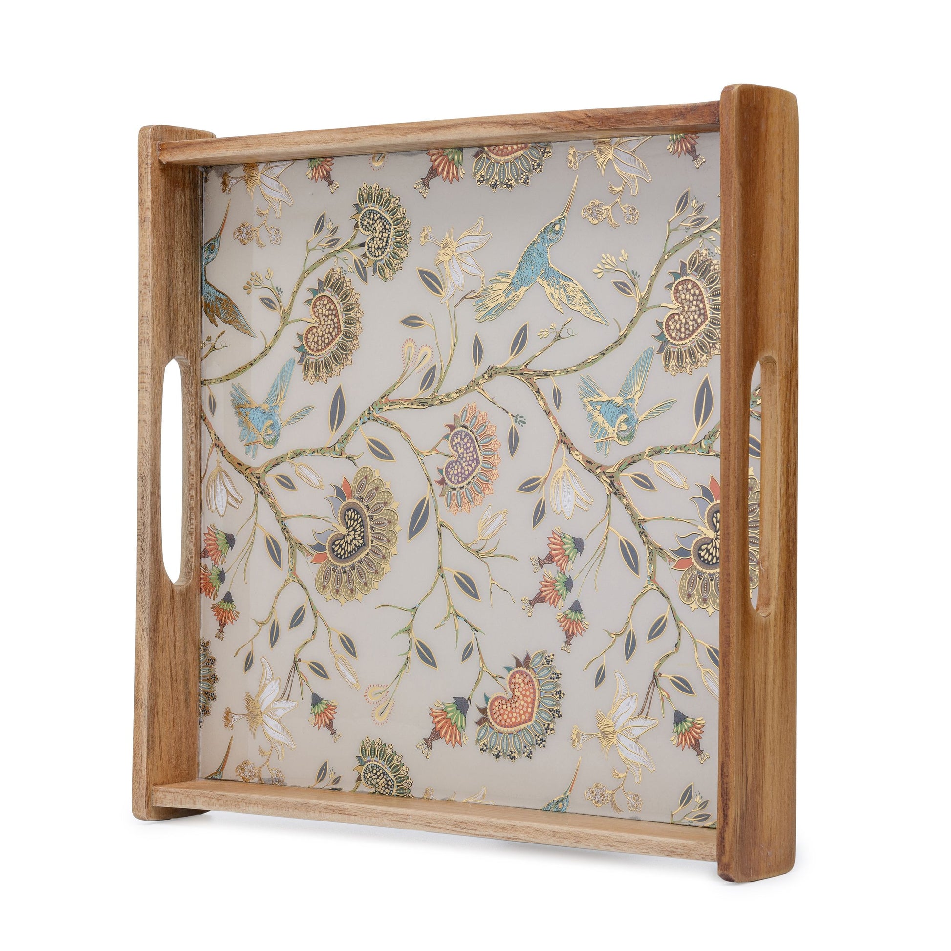Material: The frame of the tray is made up of premium quality teak wood. The base of the tray is made up of laminated mdf with resin coating.