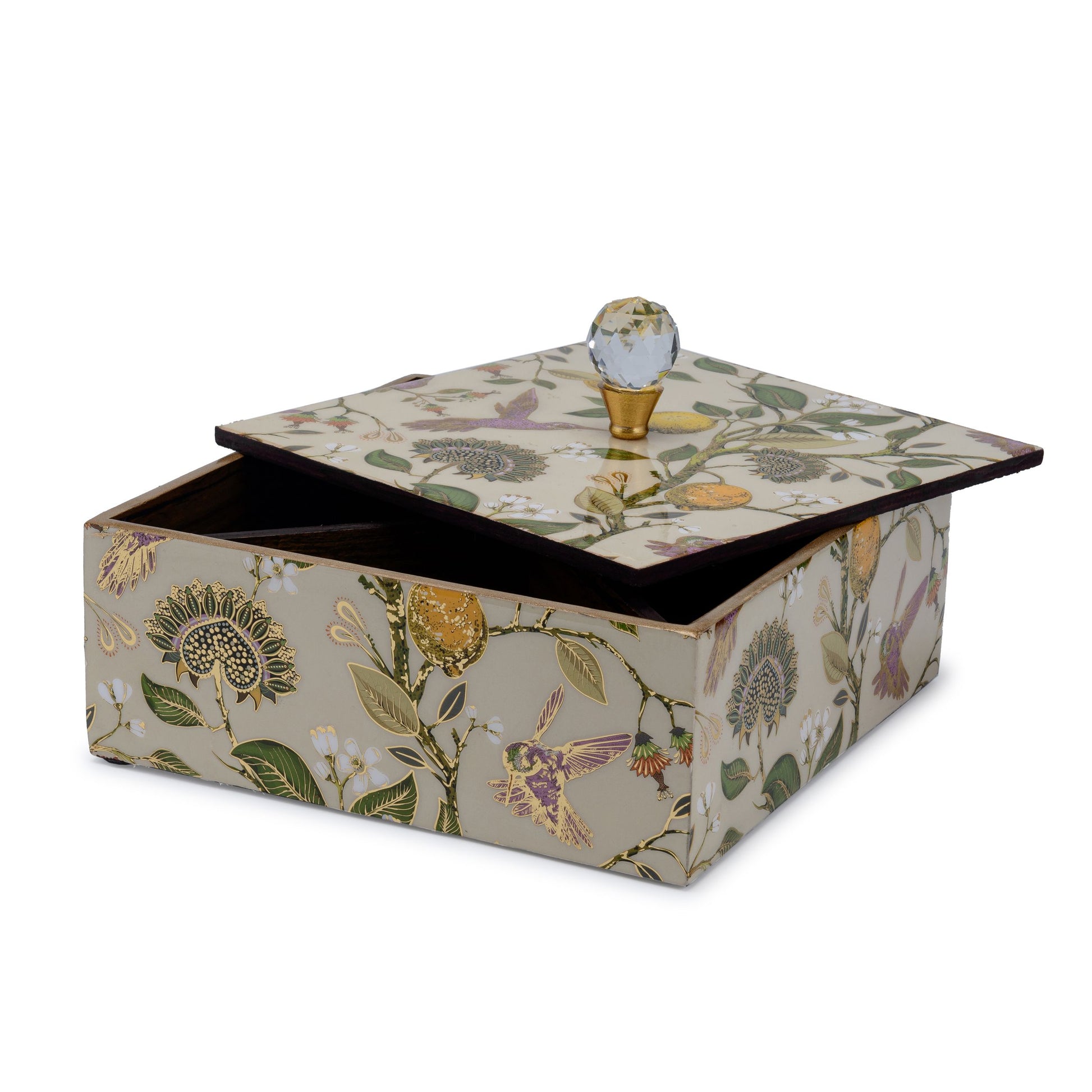 Bring onto your table the persona of a premium quality wooden storage box with a vintage golden design of, ‘Hachidori limone’.