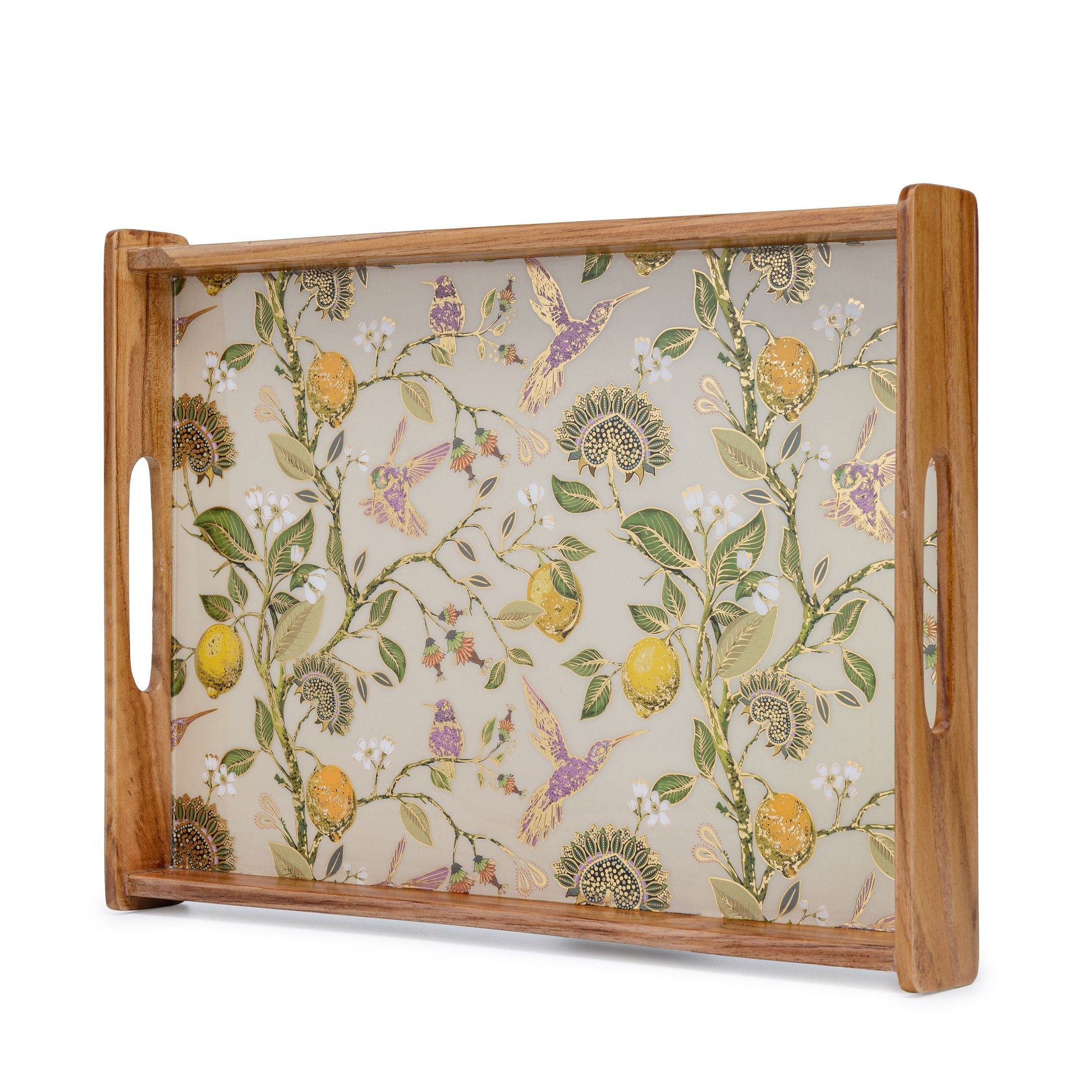 Material: The frame of the tray is made up of premium quality teak wood. The base of the tray is made up of laminated mdf with resin coating.