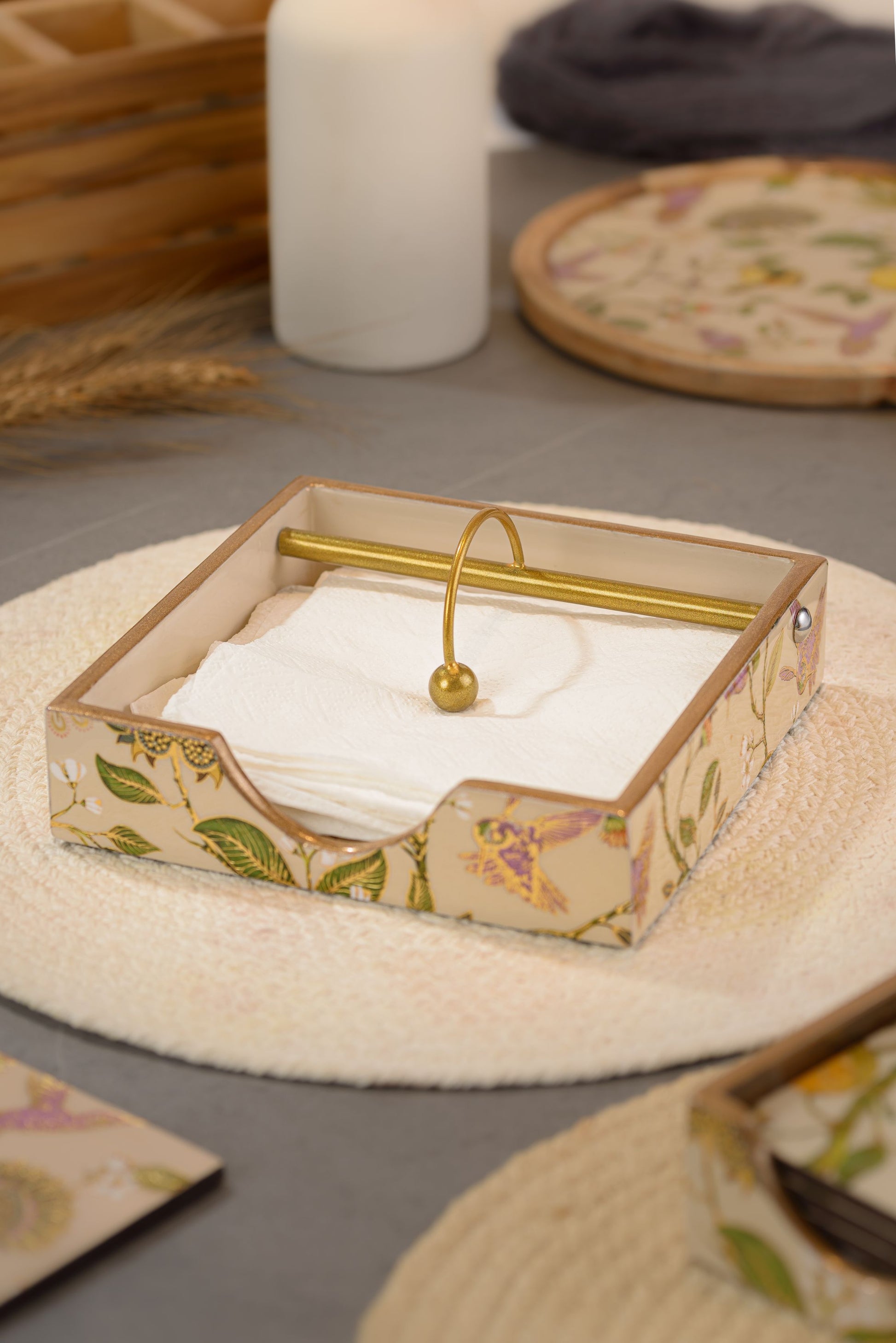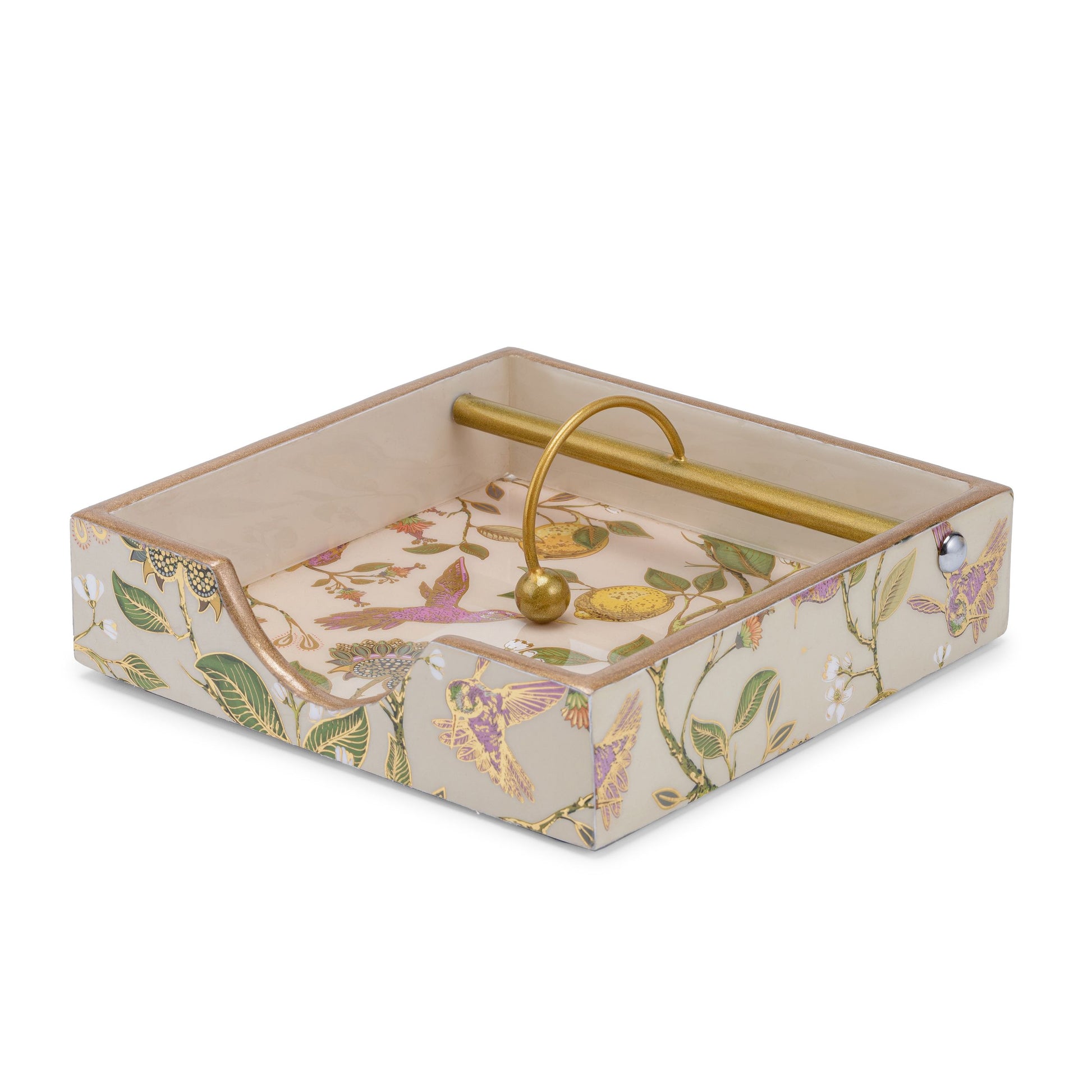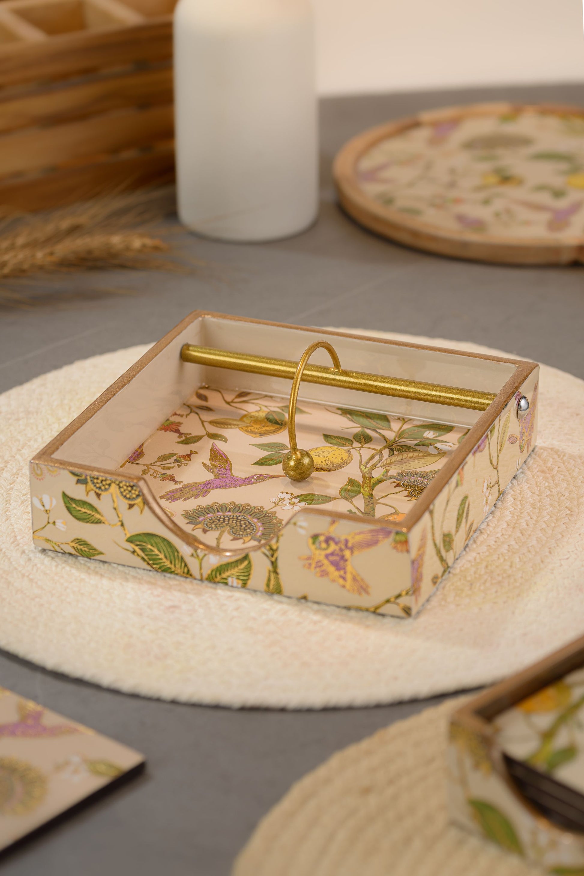Bring onto your table the persona of a premium quality designer tissue holder with a vintage golden design of ‘Hachidori limone’.