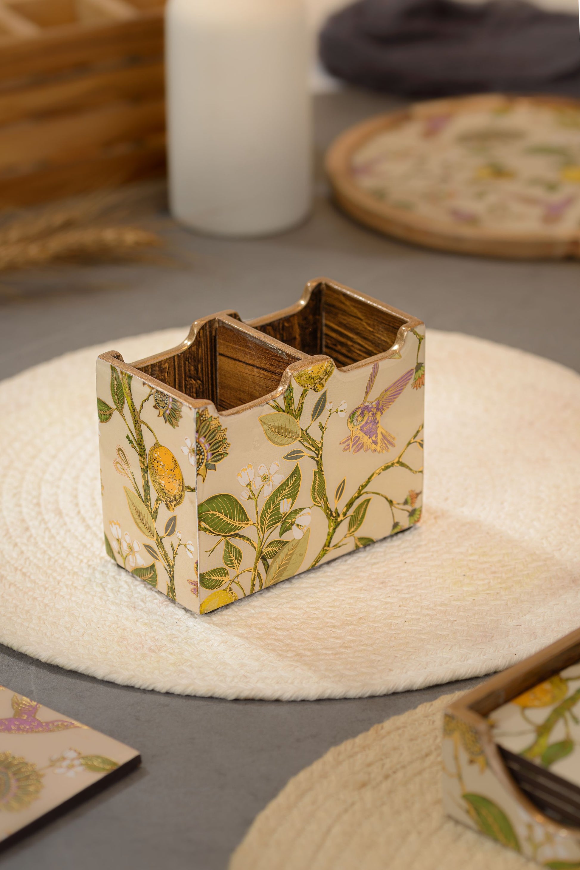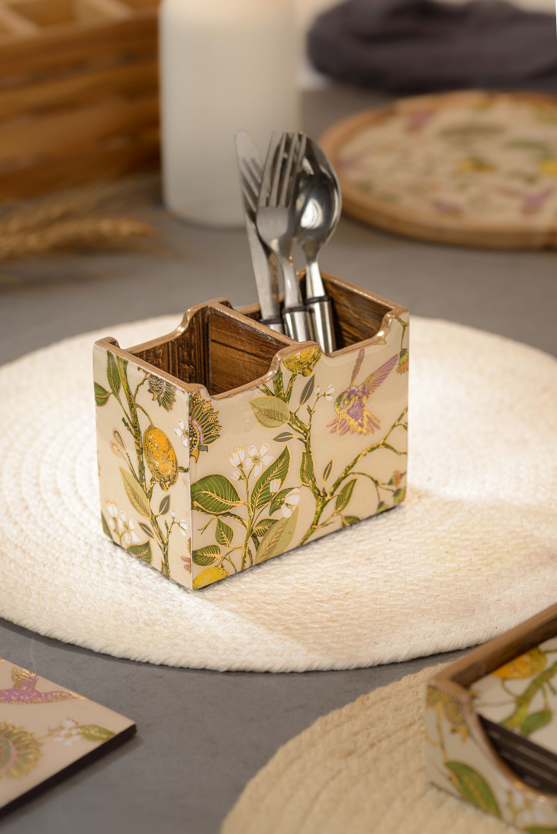 Bring onto your table the persona of a premium quality designer two-part cutlery holder with a vintage golden 'Hachidori limone' design.
