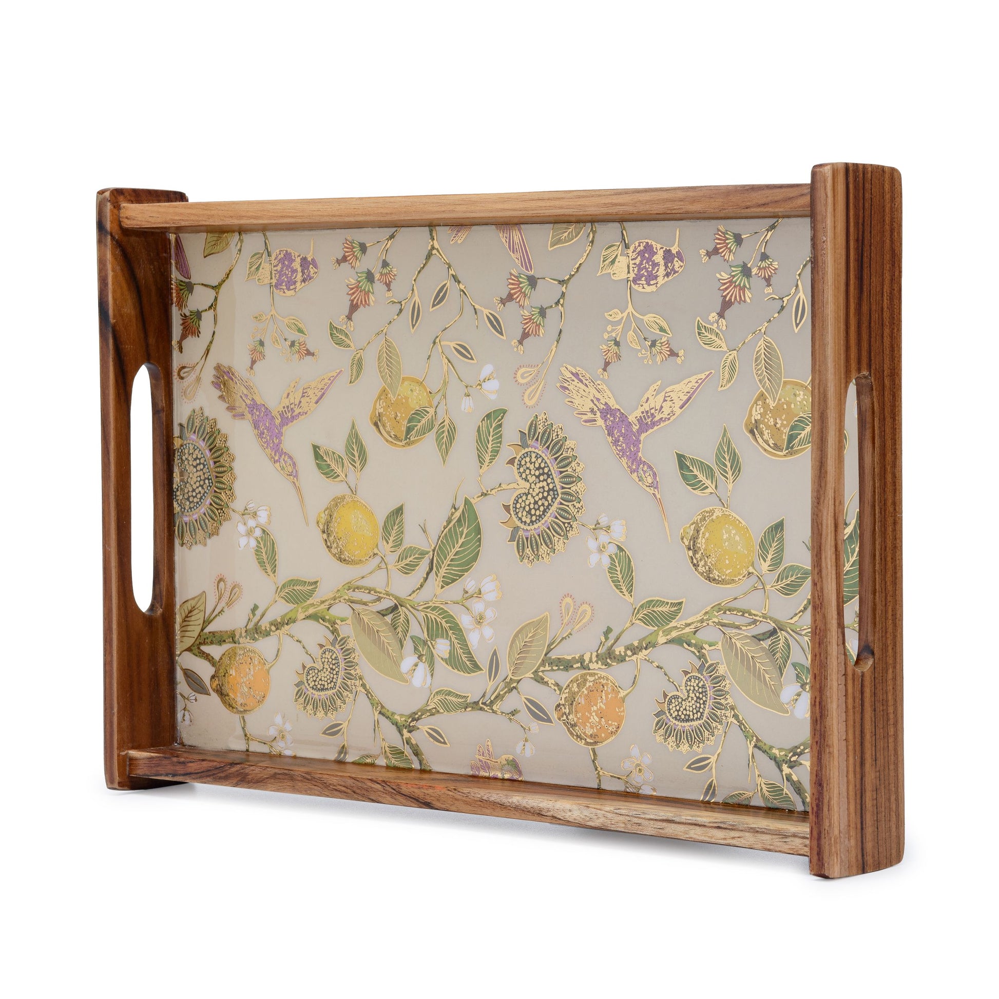 Material: The frame of the tray is made up of premium quality teak wood. The base of the tray is made up of laminated mdf with resin coating.