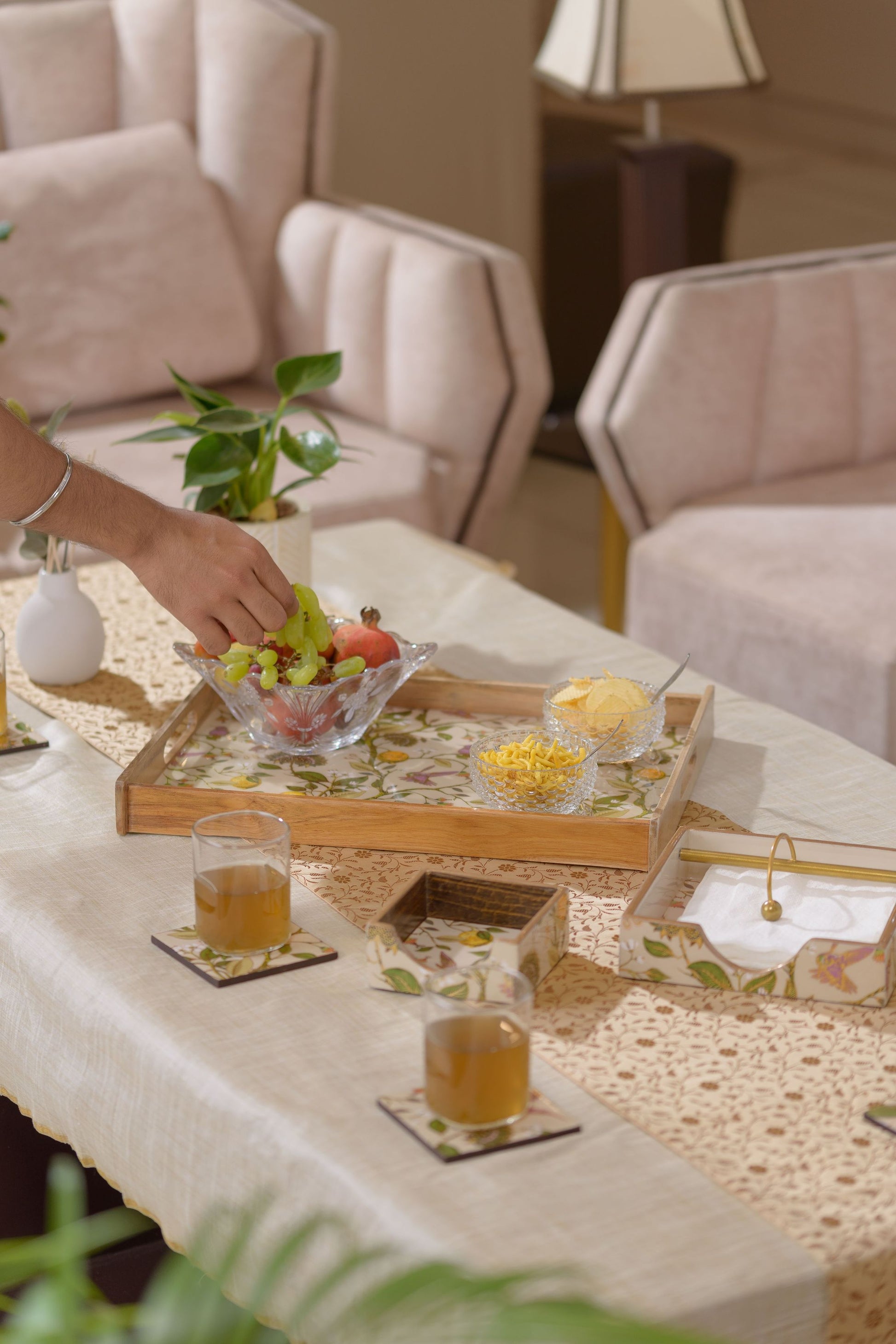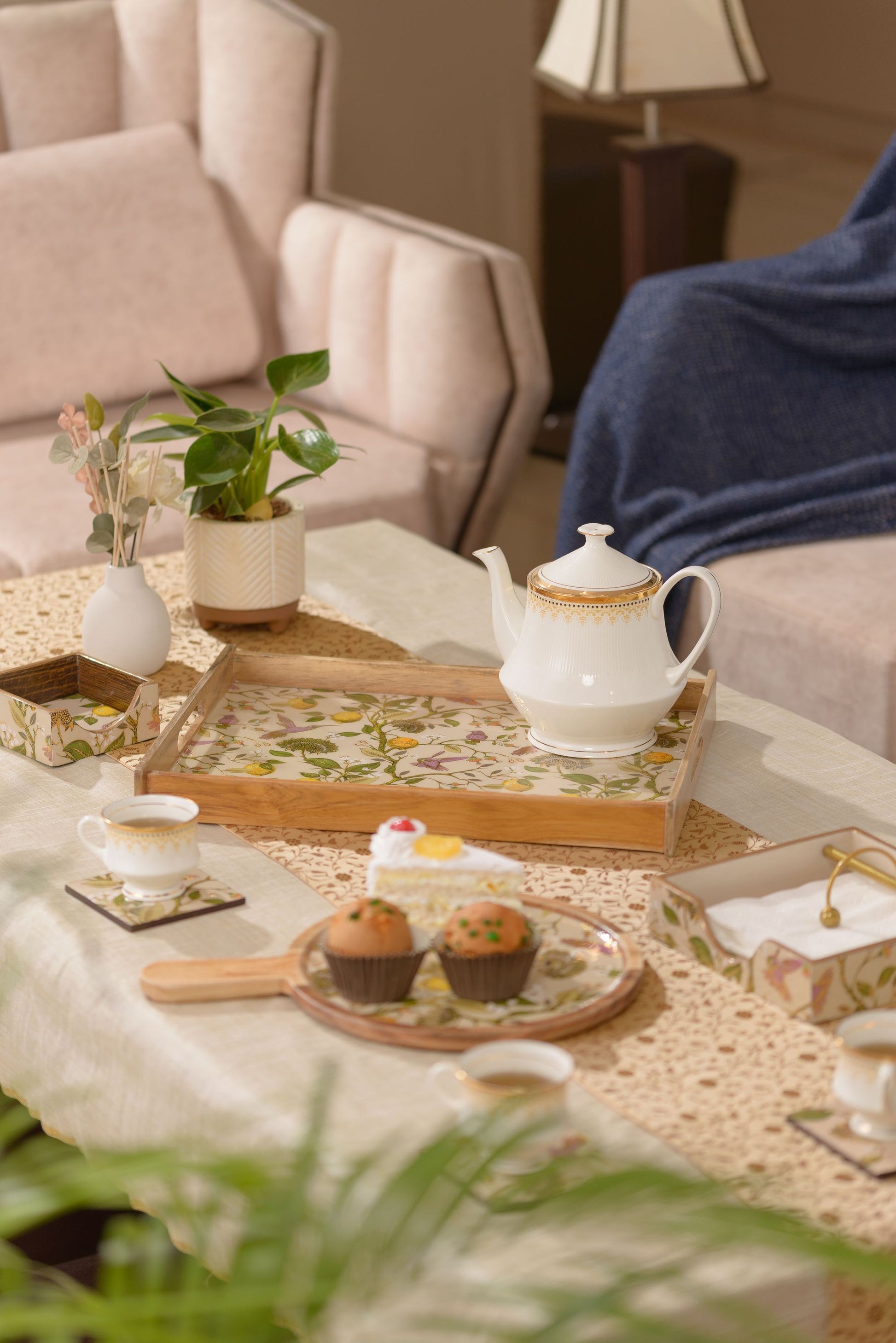 Bring onto your table the persona of premium quality teak wood with a vintage golden design of, ‘Hachidori limone’.