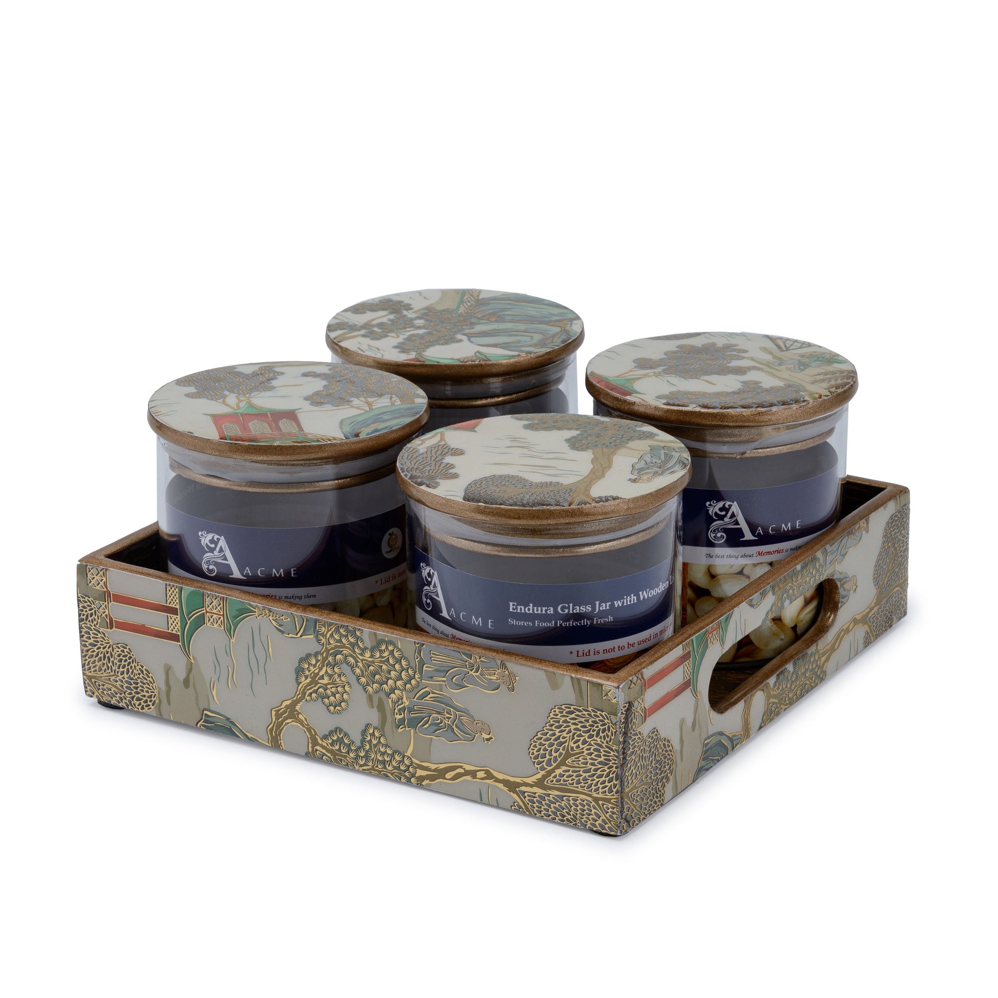 Glass jars: Four high-quality borosilicate glass jars with airtight silicone seals and designer wooden lids. (Capacity: 370ml)